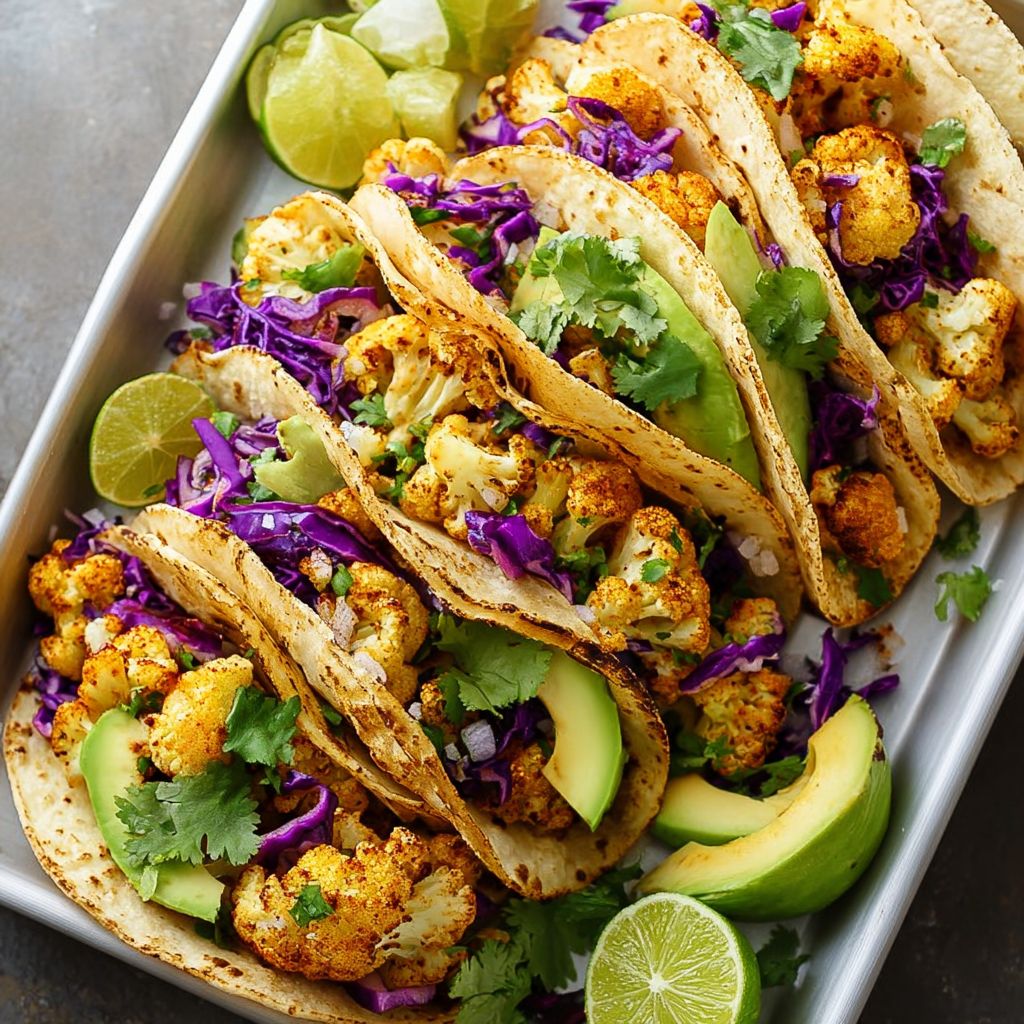 Fill each tortilla with roasted cauliflower, red cabbage, avocado slices, and cilantro.